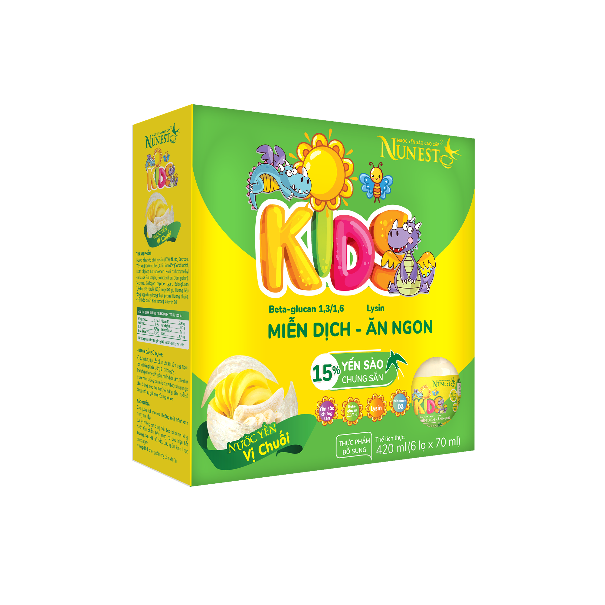 Nước Yến Sào cao cấp Nunest Kid vị Chuối 15% Yến sào chưng sẵn, Beta - glucan 1,3/1,6, Lysin, Vitamin D3...