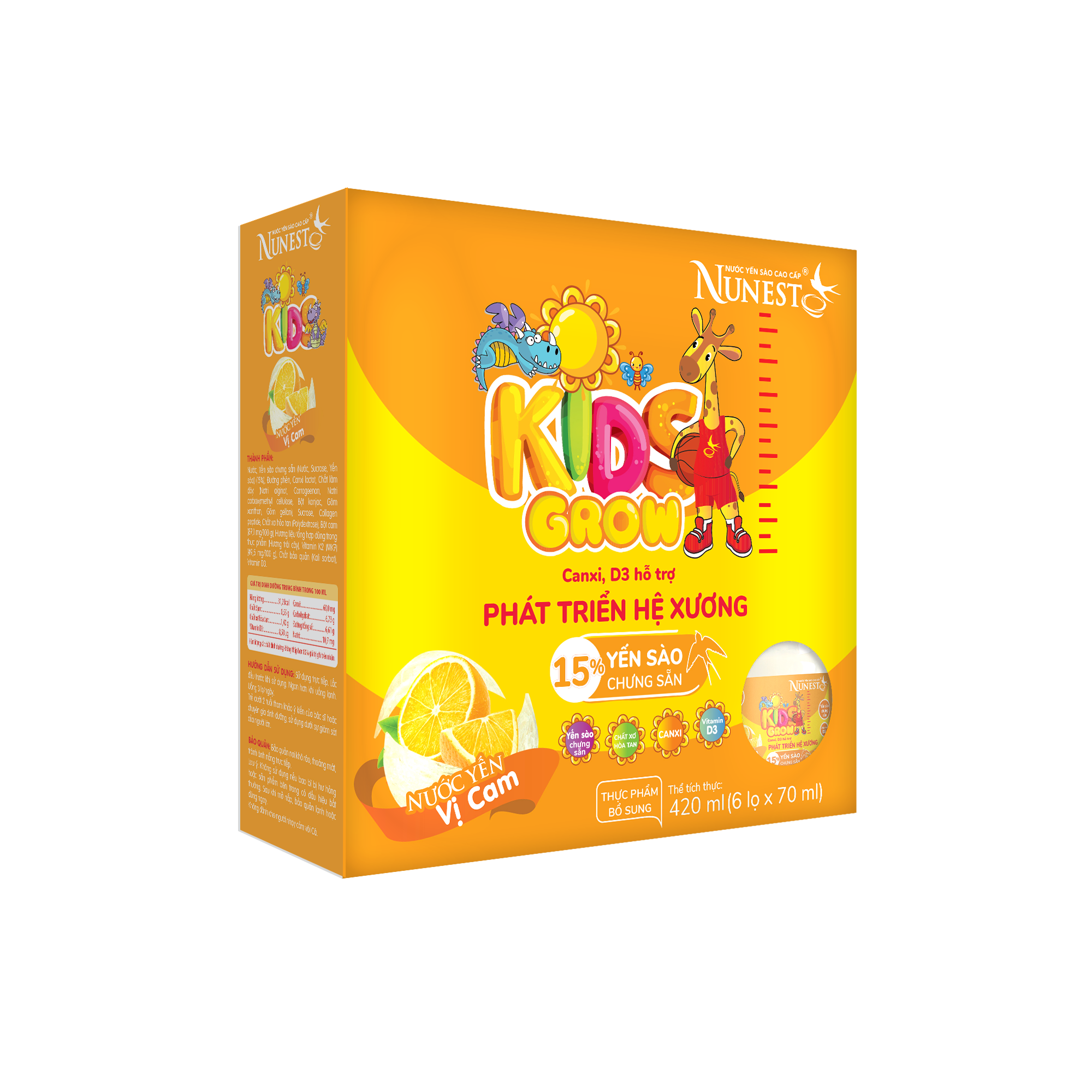 Nước Yến Sào cao cấp Nunest Kid Grow vị Cam 15% Yến sào chưng sẵn, Chất xơ hoà tan, Canxi, D3...
